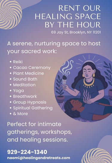 Contact us at naomi@healingandretreats.com or text 347-458-3683 for more information or visit us in person.